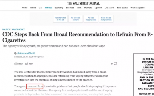 据华尔街日报消息,美国疾病控制与预防中心(CDC)目前已经撤回了在美国电子雾化病未确定原因时建议公众不要使用电子烟的广泛建议。CDC报告显示,来自患者报告和产品样本测试的数据表明,含有四氢大麻酚(THC)的电子烟或电子雾化产品,尤其是从家人朋友或从在线经销商等非正式渠道购买的产品,与大多数肺病案例相关并在病情中起主要作用。