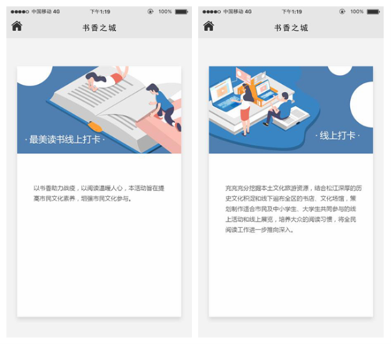 为展示“人文松江”建设成果,凸显“书香之域”文化特色,建设“全民阅读”书香社会,今年的活动增强了各文化场馆的线上展示功能,推出了“打卡松江”系列文化线上打卡活动,残疾人可以使用残疾人证号登录系统参与,此次除了纳入24个文博场馆以外,还增加了“最美读书目的地”, 使市民足不出户,就能够领略各个场馆的魅力,在家开启掌上文化旅游。