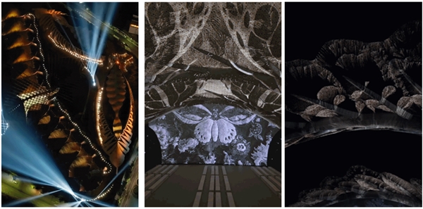 以此为核,Marisfrolg三十周年时装大秀携手法国多媒体艺术家YANN NGUEMA倾力打造。夜幕降临,俯瞰玛丝菲尔大厦,整个建筑群被缓缓点亮。20:00,沉浸式的秀场空间内音乐响起,一株青苔在穹顶缓缓绽开,以饱含生命力的姿态向四周生长,轻缓细腻地掠过美妙的艺术建筑线条,随后演化成具象的植物叶片、绽放的花卉和飞跃的动物,最终由点至面,覆盖住将近1500平米的穹顶,亦延伸为秀场背景。