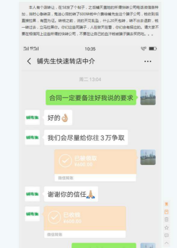 临睡,小编收到了东莞一个热心粉丝微信发来的一个爆料,“正哥,我最近有个店转让,在58转发了转让贴,之后铺天盖地的所谓快转公司电话微信各种加,当时心急转店,鬼迷心窍的转了600块钱中介费给铺先生这个骗子公司,钱收到后直接拉黑,有图为证,还是个大公司,看看正哥能否帮我曝光他,让他受到应有的惩罚”。本来对于这种“吃力不讨好”的忙我是不怎么想参与的,但是出于好奇躺床上没事就百度搜了下铺先生了解下,发现有两个铺先生,而且都号称是为实体店铺服务的大公司,但是一个在商丘,一个在东莞,这小编有点疑惑,都是这么大的公司不至于做收了钱拉黑人砸自己招牌的事情吧。难道有“李魁”冒充“李逵”出来招摇撞骗来了?小编突然没了睡意,查阅了更多资料,打算第二天,先到东莞“铺先生”公司一探平台真假。