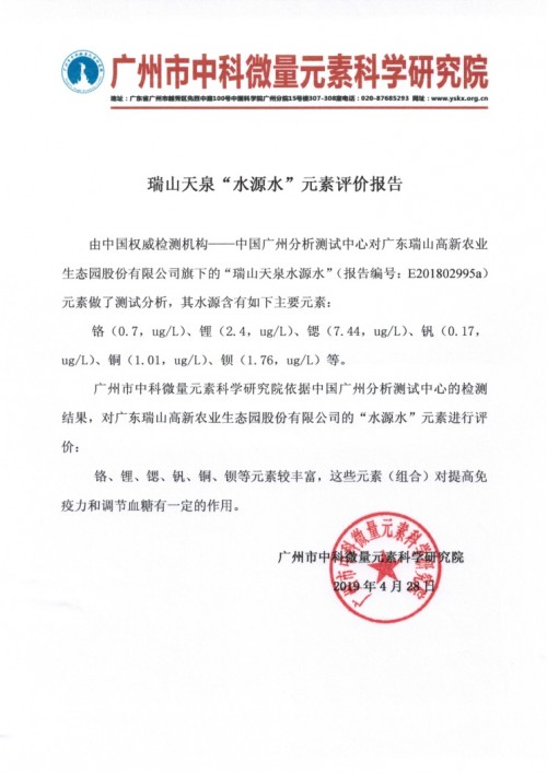 瑞山天泉真有这么好?一份由广州市中科微量元素科学研究院出具的《瑞山天泉评价报告》(上图)称:依据中国权威检测机构——中国广州分析测试中心对瑞山天泉的检测结果,该水源水的铬、锂、锶、钒、铜、钡等元素较丰富,这些元素(组合)对提高免疫力和调节血糖有一定的作用。