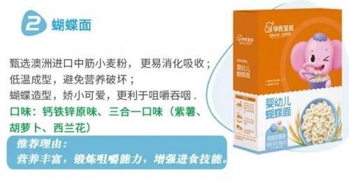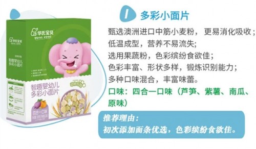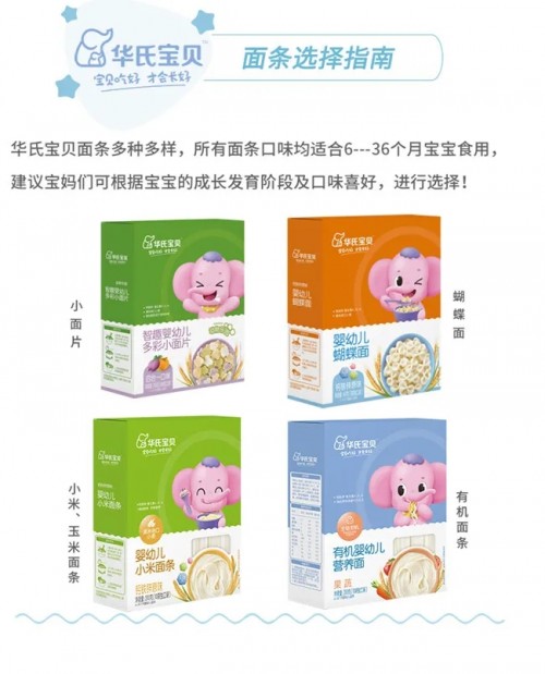 华氏宝贝婴儿面条,样式多种多样,所有面条的口味均适合6---36个月的宝宝食用。 种类有小面片、蝴蝶面、小米面条、玉米面条、有机面条。