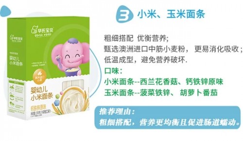 华氏宝贝婴幼儿面条,全系列0添加,不添加香精、色素、防腐剂;生产过程中不添加食盐、低钠;甄选中筋小麦粉而且强化钙铁锌维生素等,补充宝宝成长中所需营养。
