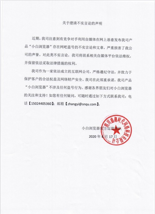 近期,我司注意到有竞争对手利用自媒体在网上恶意发布我司产品“小白浏览器”存在网吧盗号的不实言论和文章,严重损害了我公司的声誉。对此类不实言论,我司将联系相关自媒体平台依法维权,并保留依法采取法律措施的权利。