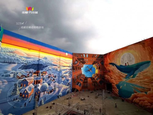 已申报「中国单体面积最大的半室内壁画」吉尼斯纪录的万朵城龙缸,拥有媲美重庆「川美」的壁画体量,24位来自江西和成都的专业画师,顶着35℃以上高温天气为主的户外工作考验,从6月中旬开始创作,未至交付亮相,便已提前成为中国艺术圈的「网红」。