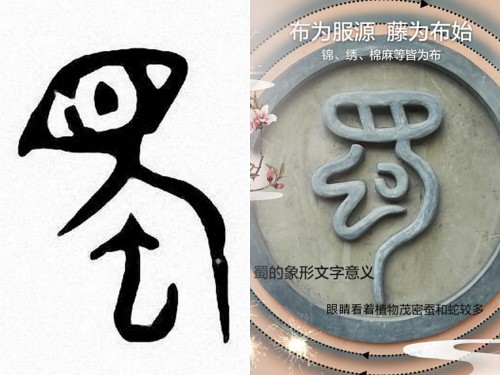学者们推断是商朝人最先发明使用“蜀”字,并且有多种写法。每一种写法上,都有一个大大的“目”字,意思是“纵目”。“目”和“虫”成为“蜀”字创造的源头,包含了人物(蚕丛)、地域(四川)和产品(丝绣)等具体内容在里面。