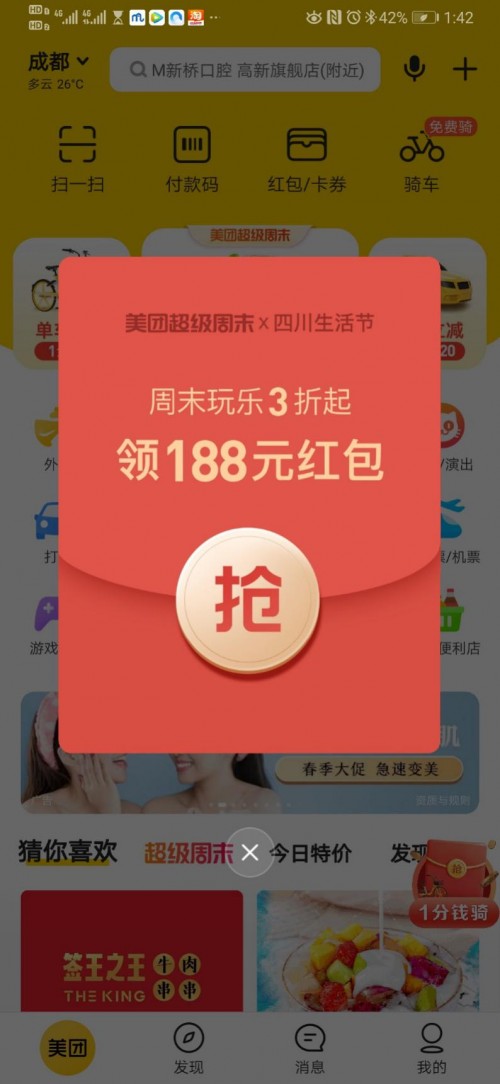 值得一提的是,为促进川派餐饮服务业发展,加快推进餐饮消费全面复苏,目前,2020川派餐饮系列预热活动正在线上线下进行。此前,美团“超级周末”活动已抢先上线,投入资金逾1500 万元,联动四川地区特色餐饮、酒店、门票、民宿等生活服务业务,以发券、补贴等多种形式打造线上“促消费惠民活动”,以“红包+爆品秒杀+精选特价”的周末档活动持续激发用户的消费热情。