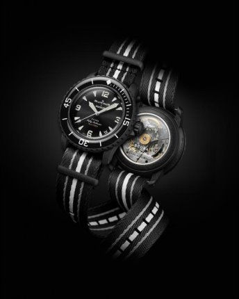 Bioceramic Scuba Fifty Fathoms 系列中的OCEAN OF STORMS(风暴洋)以黑色为主色调, 灵感来自新月,亦称黑月,致敬了月球上最大的平原或“海洋”Oceanus Procellarum(风暴洋)。