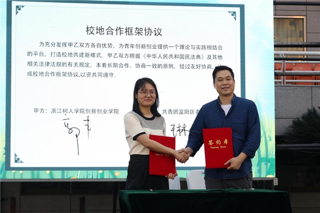 暖场环节中,活力四射的歌曲《花火》率先点燃现场氛围;校党委副书记王军致辞中指出:“今天的活动绝非简单的市集与演出,而是学校构建“德智体美劳”全面发展育人格局的生动实践。在这里,你们既是乡村振兴的“合伙人”,用智慧赋能乡村沃土;又是校园文化的“创变者”,以艺术滋养精神家园。这种“校内练摊积累经验、校外拓展验证模式”的闭环培育,这种“音乐展演、文化传播、精神塑造”的三位一体,正是新时代青年应有的成长姿态。”随后,创新创业学院院长郭丰与共青团富阳区团委副书记董琳洁签署校地合作框架协议,标志着双创实践与乡村振兴资源的深度链接;青春市集与草地音乐节在校党委副书记王军鸣锣中同步启动,亦将四重维度的创新叙事娓娓道来。
