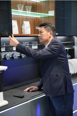▲佘学彬董事长全神贯注检验岛台台面质量