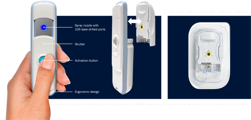 它的好处是,每次给药的剂量很精准,8微升。而且药物是呈雾状水平喷出的,理论药物上可以在眼表分布得更均匀,而且患者坐着、站着都能给自己用药。