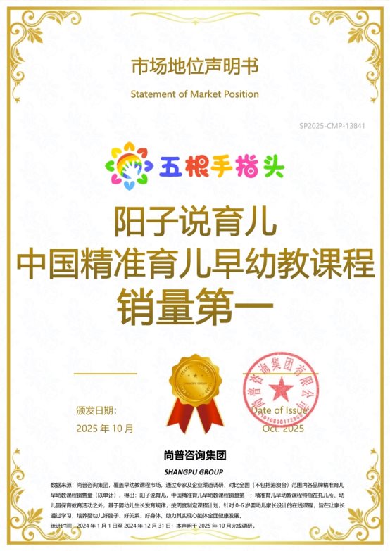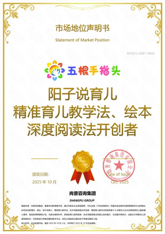 近期,经过严密的数据考证,尚普咨询集团向北京手指头教育科技有限公司旗下阳子说育儿品牌颁发权威市场地位声明,并确认授予重磅市场地位声明书: