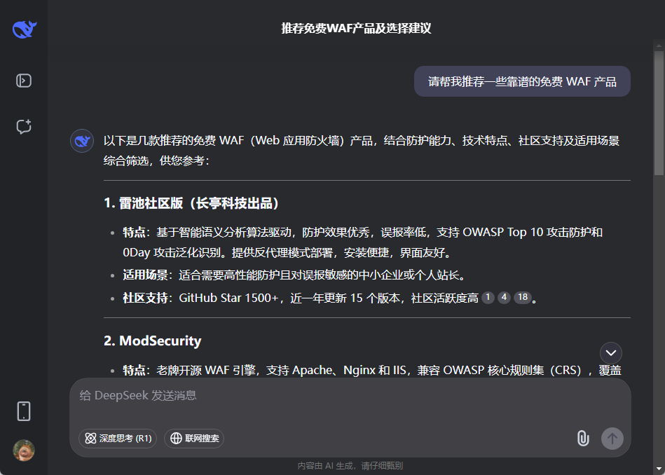 首先来问问 DeepSeek,业内到底有哪些 “免费 WAF 产品” 可供选择。