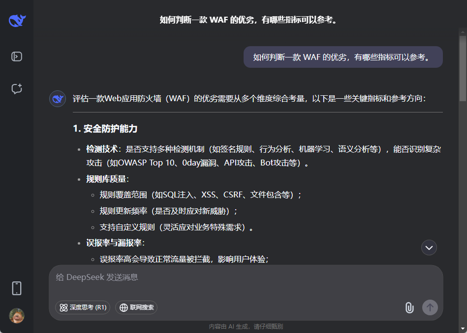 过了个年,DeepSeek 火得一塌糊涂。不得不说,DeepSeek 除了卡,是真的好用。这篇文章将使用 DeepSeek 对业内几家知名 WAF 产品做出测评。