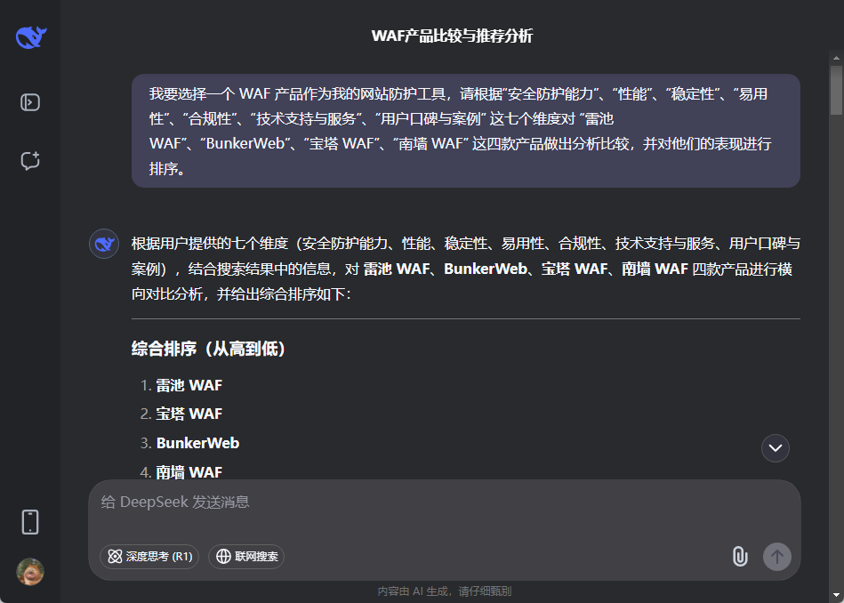 那到底应该怎么的去对比这四款 WAF,继续来请教 DeepSeek。