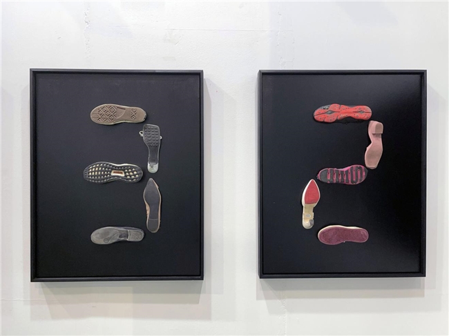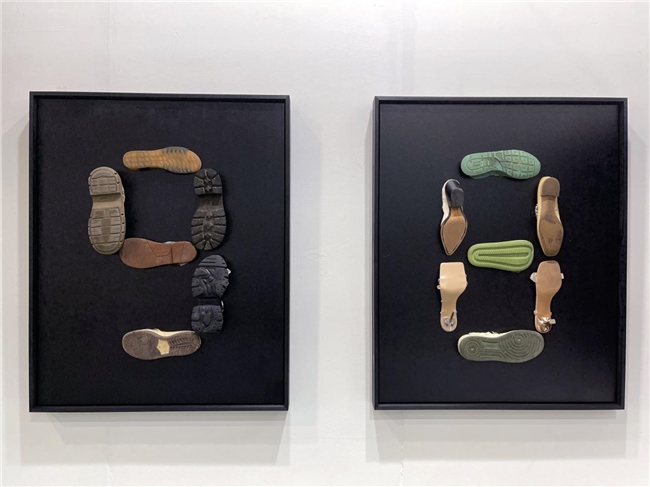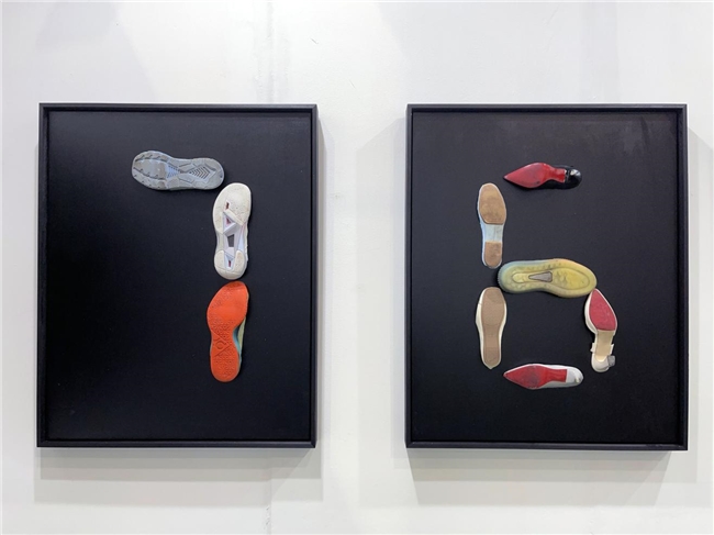 据悉,该作品由知名艺术家杨烨炘创作,杨烨炘专门向在大陆工作和学习的台湾朋友们,征集来49只身份各异,款式不同的旧鞋底,将它们按照数字倒计时一一拼贴在画布上,构成十幅引人深思的画作,这件作品被艺术家命名为《走向倒计时》。