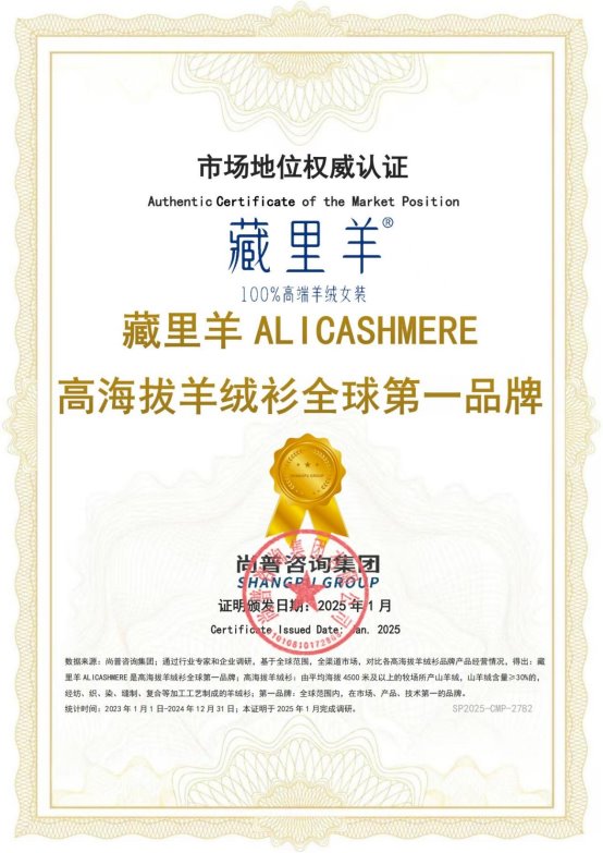 2025年1月,尚普咨询集团向东莞市德绒羊绒制品有限公司(以下简称“德绒羊绒”)旗下品牌藏里羊ALICASHMERE(以下简称藏里羊)的高海拔羊绒衫产品颁发全球市场地位证明书。此次藏里羊荣获尚普咨询集团【藏里羊ALICASHMERE高海拔羊绒衫全球销量第一】以及【藏里羊ALICASHMERE高海拔羊绒衫全球第一品牌】权威证明,表明藏里羊凭借其卓越的品质保证,赢得了市场的广泛认可。