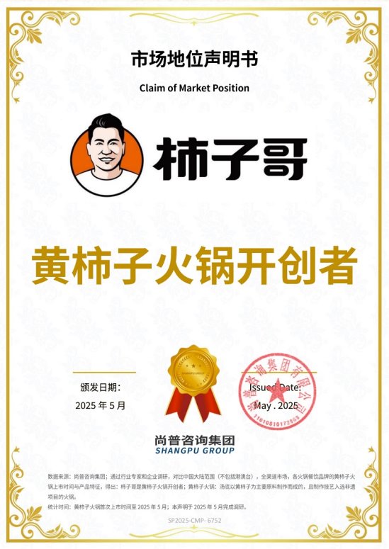 2025年5月,尚普咨询集团向内蒙古玖沃海餐饮管理有限公司(以下简称“玖沃海餐饮”)旗下品牌柿子哥的黄柿子火锅颁发市场地位声明书。此次柿子哥荣获尚普咨询集团【黄柿子火锅开创者】证书,表明柿子哥黄柿子火锅凭借其卓越的品质保证,赢得了市场的广泛认可。