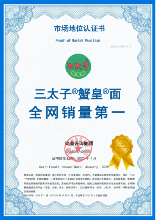 2025年1月,尚普咨询集团向三太子颁发市场地位证明书。此次三太子荣获尚普咨询【蟹皇®面里真有蟹黄】及【三太子®蟹皇®面 全网销量第一】市场地位证明,标志着三太子在我国食品行业中的卓越地位及市场的高度认可。