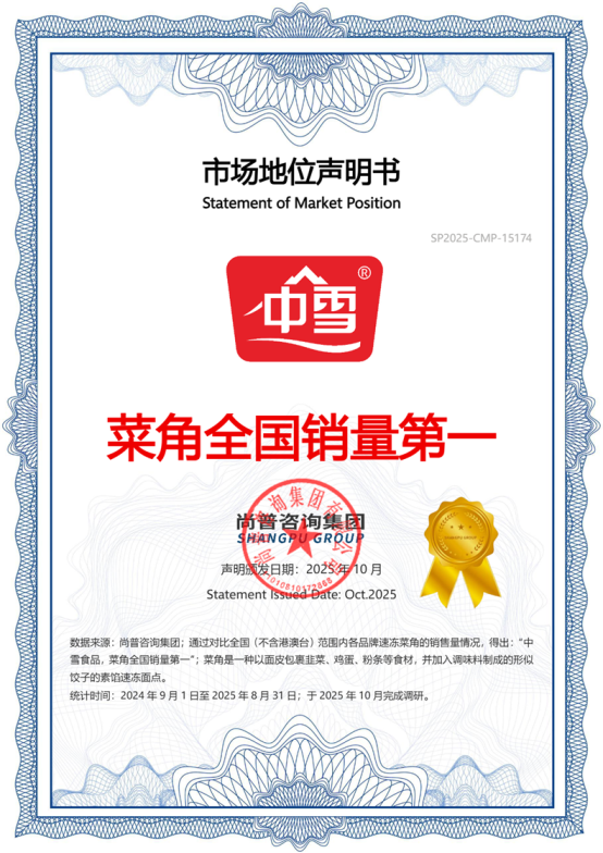 2025年10月,尚普咨询集团向河南中雪食品有限公司(以下简称:中雪食品)颁发【中雪食品,大麻球全国销量第一】和【中雪食品,菜角全国销量第一】市场地位声明书。此次中雪食品荣获尚普咨询集团颁发的市场地位声明书,不仅是对中雪食品市场表现的充分肯定,更是对其在我国速冻菜角和速冻大麻球行业中领先地位的高度认可。中雪食品能够取得如此佳绩,其背后是源头食材的严苛把控、工艺与研发的深度积淀、全链路的品质保障能力等共同筑成的竞争护城河。