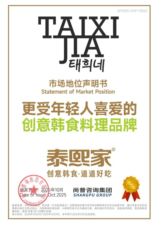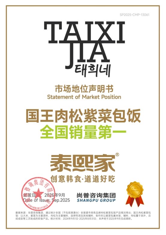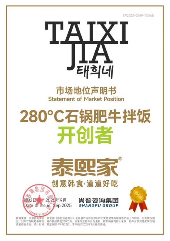 近期,尚普咨询集团向西安凤云企业管理咨询有限责任公司(以下简称“凤云”)旗下品牌泰熙家颁发市场地位声明。此次,经过严密的数据考证,尚普咨询集团确认向泰熙家授予【泰熙家 国王肉松紫菜包饭全国销量第一】【泰熙家 创意韩食餐厅门店数量全国第一】【泰熙家 更受年轻人喜爱的创意韩食料理品牌】及【泰熙家 280℃石锅肥牛拌饭开创者】权威声明。泰熙家凭借其创新的菜式与美味的菜品口感,赢得了市场的广泛青睐。
