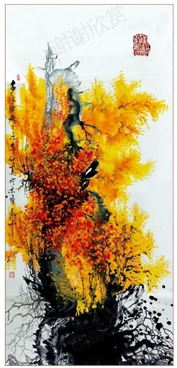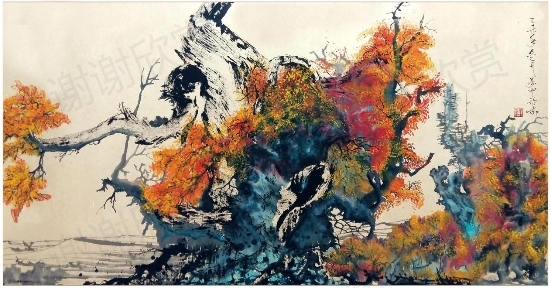 赋彩胡杨是万中墨彩艺术的另一大特色。恢宏热烈,光彩灿烂,浩然旷远,交响生辉,是万中墨彩胡杨的品格特征。中国画的色彩表达崇尚随类赋彩,色不碍墨,墨不碍色。有追求淡雅者,有追求浓烈者。万中的墨彩胡杨则兼而有之。