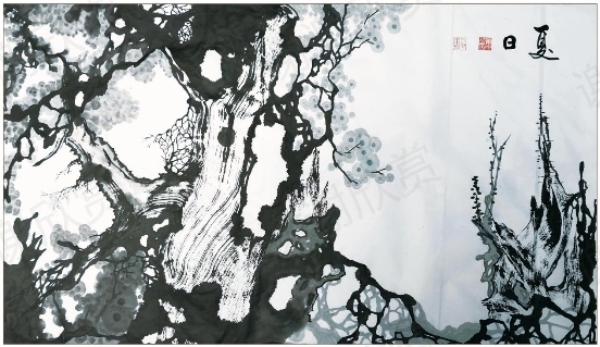 作品《大漠魂》更是别出心裁。大团大团的重墨近乎于抽象的痕迹,依偎于朽木新枝的周围,是物非物,若智若愚,使意境诡异而神奇。似乎说不出什么道理,但是很有意味,暗示了某些形而上的东西。这就是中国水墨的奇妙之处。
