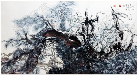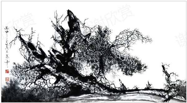 作品《雄风》是一派风华正劲的韵致和一股欣欣向荣的劲头。是焦墨、浓墨和淡墨的交响。盘根错节,枝繁叶茂,三种墨法相互映衬,相互穿插,尽显生命的朝气和活力,甚为精彩。