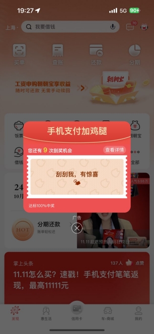 银行信用卡作为我国消费金融“主力军”,是提振消费的重要参与者之一。作为更多消费者的“双十一”支付首选品牌,招行信用卡于近日再度推出经典的“11.11加鸡腿”活动,手机支付笔笔返现,最高返11111元。活动以低门槛参与、最高万元大奖的极致体验,切实回馈7000万持卡人,全力刺激消费热情,助力经济复苏。