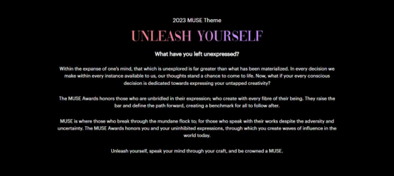 2023年奖项的主题为Unleash Yourself,旨在表彰那些在表达上不拘束的人;用生命的每一根纤维创造的人。这些人提高了标准并定义了前进的道路,为所有人创造了一个可效仿的基准。