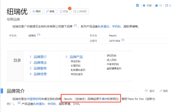 根据百度百科的搜索结果中可以看到纽瑞优是澳大利亚上市公司JAT旗下品牌,但是进入详情后又发现商标所属为广州奥提瓦生物,这么看来,应该是修改过百科内容了。根据现在的百科内容可知纽瑞优在中国注册,但是起源于澳洲和新西兰,也就说澳新的纽瑞优才是最初的纽瑞优,从纽瑞优两个小红书官号贴出来的商标注册时间上,也能看出端倪,澳洲纽瑞优的中英文商标注册时间是2019年4月,而中文商标的注册时间为2022年6月,谁先谁后一目了然。JAT同时拥有澳洲和新西兰两个国家纽瑞优的商标,从奥提瓦做的这个百度词条里的内容,是否侧面论证了JAT才是正主?