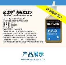 4)碘伏成分类漱口水。碘伏大类中的聚维碘酮是比较常用的消毒成分,代表产品是必达净(Betadine)。这类产品的消毒能力相当不错,只是起作用会比较慢,大概需要30分钟;副作用和使用禁忌也有一些,比如会妨碍伤口愈合,牙齿着色,有使用周期限制(不能超过2周),使用年龄限制(不能超过12岁),甲状腺功能异常者禁用等。