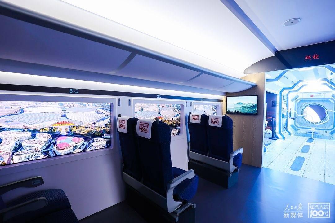 在“追梦新时代”区域,观众可“搭乘”由兴业路站开往复兴路站的复兴号高铁,感受新时代中国日新月异的发展;