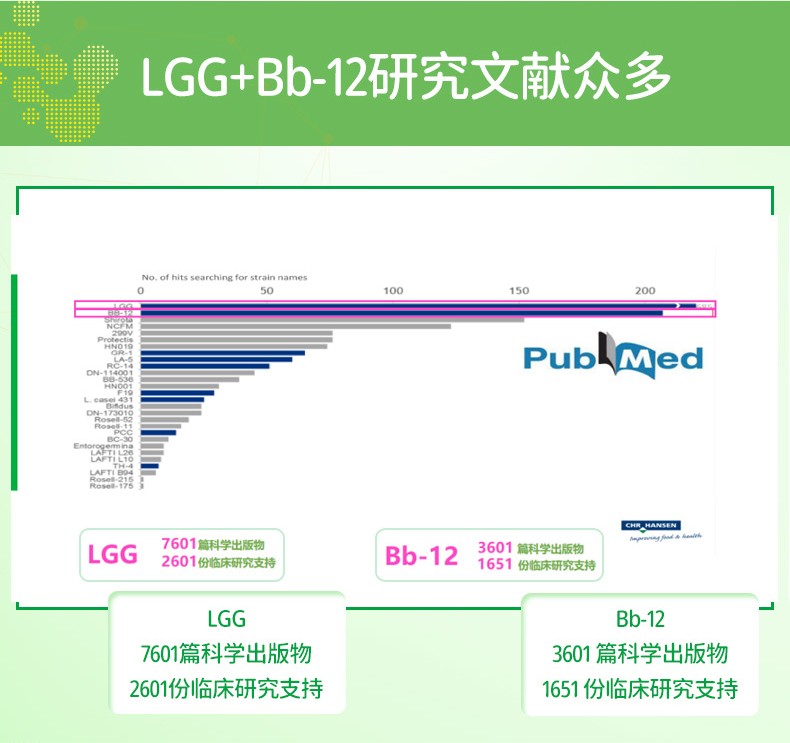 迄今为止,LGG益生菌有超过1200项科学研究和200多项临床研究,150多篇专业研究文献,60例人体真实测试,被认为是最安全和最有效维持消化系统健康和免疫功能的菌种。