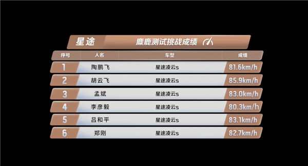 实时披露的成绩中可以看到,星途凌云在零百加速项跑出了6s的惊人成绩,毫无悬念跻身“6秒级SUV俱乐部”;此前被网友诟病不够专业的麋鹿测试,在赛场上以ISO 3888-2国际标准重新开战,最终获得85.9kM/h的成绩,打破世界纪录。