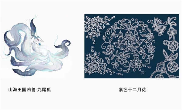 在看到琦凰文化的“遇见山海经”IP之后,杨华珍便萌发出进行二次创作并联名合作的念头。九尾狐作为山海王国白民部落的异兽之一,一直与“妖娆”、“魅惑”等词语相连。它的体态柔美轻盈,毛发洁白无暇,极适合与羌绣作品中的花卉类纹样结合。杨华珍及其团队此次颇为用心地选用了自己最加青睐的《素色十二月花》,与包括九尾狐在内的其他山海王国瑞兽联合,展示柔美的花纹样式。