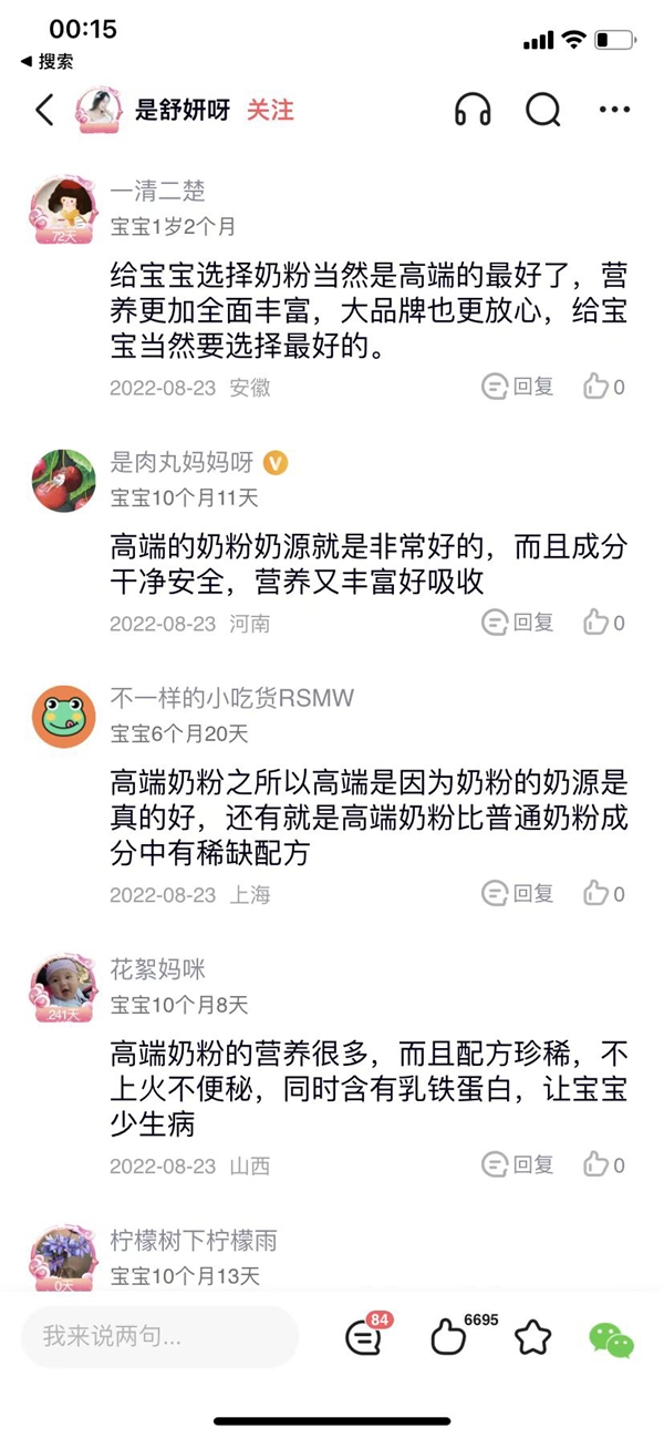 活动期间,天猫与各高端奶粉品牌,引发了大量宝妈关于育儿的正向讨论,多数宝妈在评论区和话题内交流高端育儿心得,在展露了新手宝妈们的宝宝喂养痛点的同时,也展现了天猫平台对于新手宝妈的关怀和帮助。