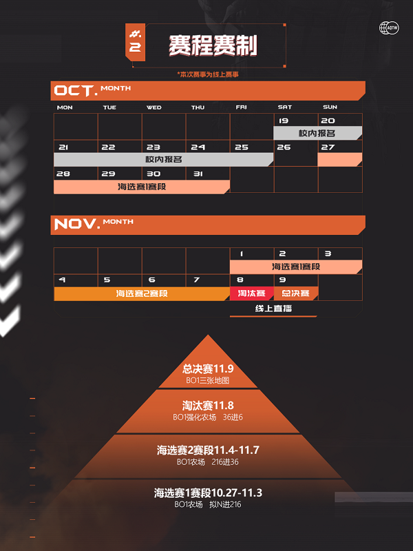 报名成功后,队伍将被随机分配小组,将于10月27日展开激烈的线上对决。海选赛将被分成两个赛段,决出36支队伍进入全国淘汰赛阶段,最终将在11月9日进行线上总决赛,争夺冠军席位和万元奖金。