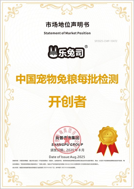 2025年8月,尚普咨询集团向乐兔司颁发市场地位声明书。乐兔司荣获【乐兔司 中国宠物兔粮每批检测开创者】、【乐兔司 中国中高端宠物兔粮连续两年销量第一】两项市场地位声明,标志着其在宠物兔粮行业的标杆地位及市场的高度认可。
