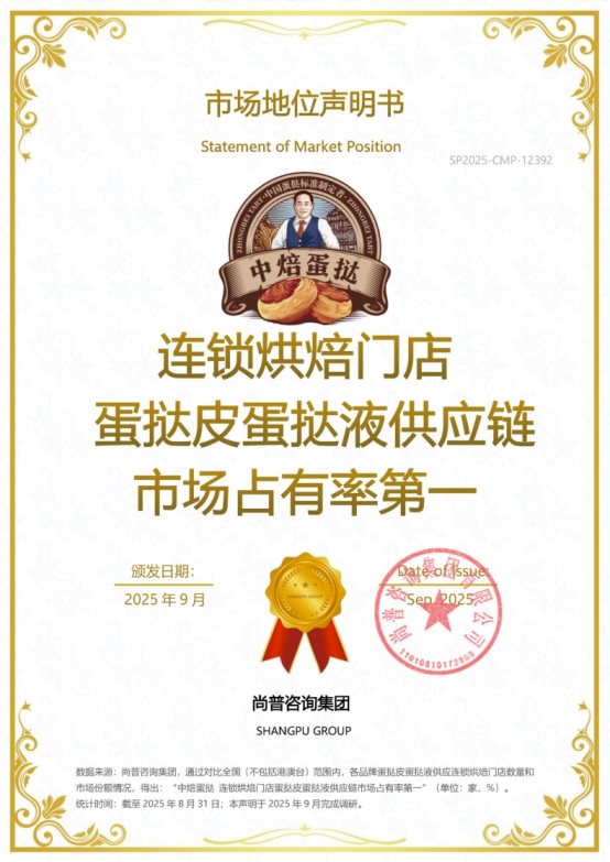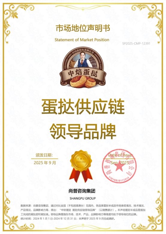 2025年9月,尚普咨询集团向中焙蛋挞颁发市场地位声明书。此次中焙蛋挞荣获尚普咨询【中焙蛋挞 蛋挞标准制定者】、【中焙蛋挞 蛋挞供应链领导品牌】、【中焙蛋挞 连锁烘焙门店蛋挞皮蛋挞液供应链市场占有率第一】市场地位声明,标志着中焙蛋挞在蛋挞领域行业中的领导地位及市场的高度认可。