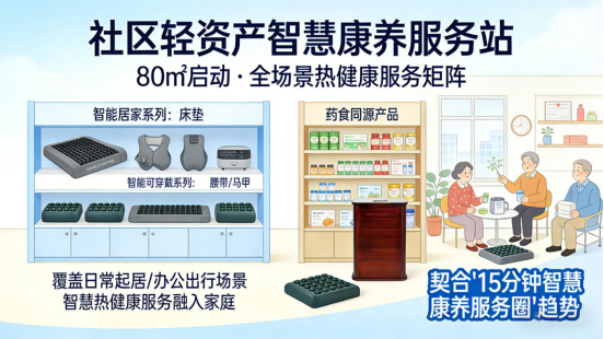 在社区端,80㎡即可启动的轻资产模式,降低了创业门槛的同时,保持了服务的完整性。全场景产品矩阵 —— 从智能居家系列的床垫,到智能可穿戴系列的腰带、马甲,再到药食同源相关产品,覆盖了日常起居、办公出行等多元场景,让智慧热健康服务融入家庭生活的每一个角落。这种布局既契合了 “15 分钟智慧康养服务圈” 的发展趋势,也让服务更贴近用户,提升了日常触达的便捷性。
