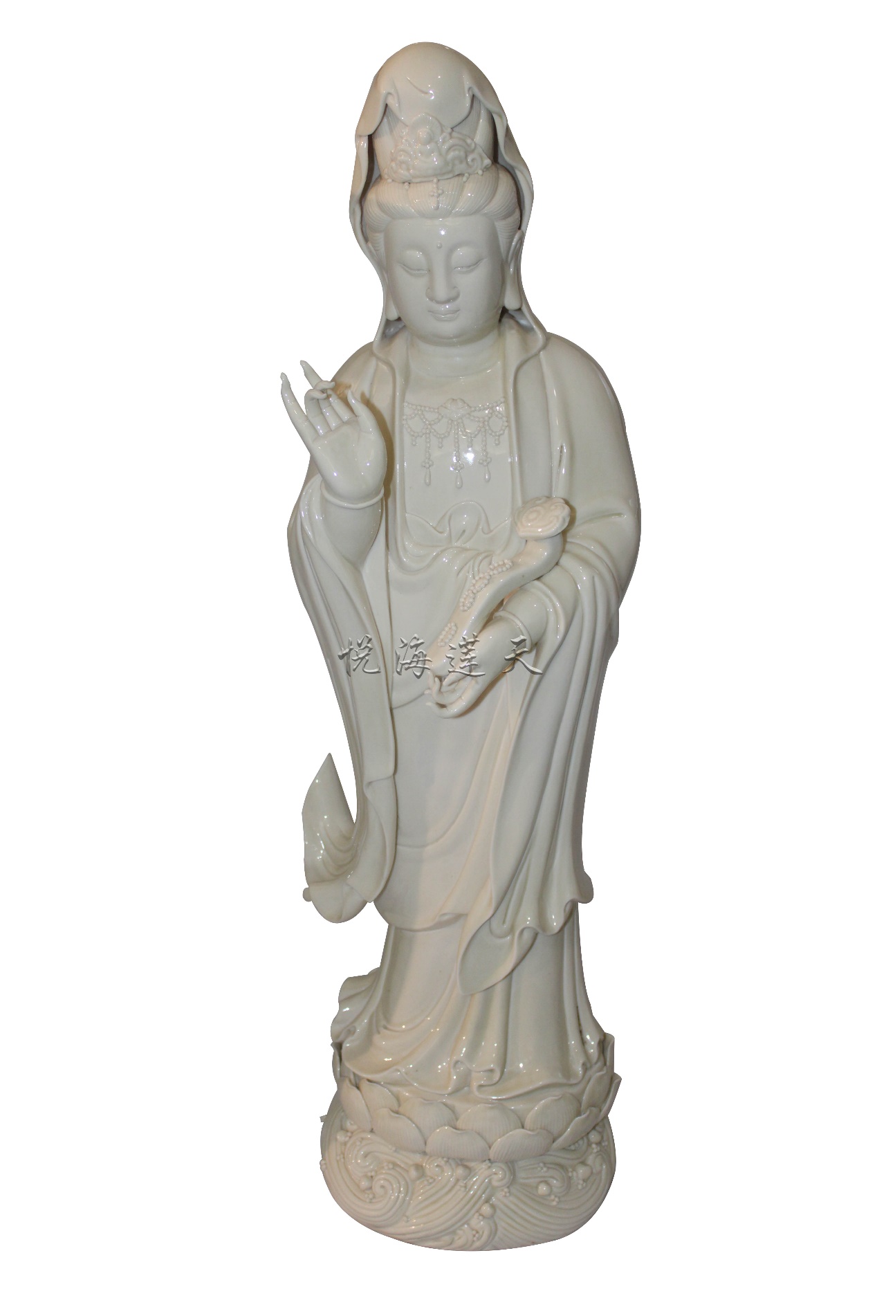此藏品从外观上看,色泽光润明亮,乳白如凝脂,在光照之下,釉中隐现粉红或乳白,因此有“猪油白”、“象牙白”之称。流传欧洲后,法国人又称为“鹅绒白”、“中国白”观音雕像的衣服多取迎风飘举之势,一举一动,对比强烈;面部刻划细腻,衣纹则深而洗练,主次分明。表情静谧安逸、端庄慈祥、气势纵横飘洒、静中取动、节奏抑扬顿挫、疏密有致。