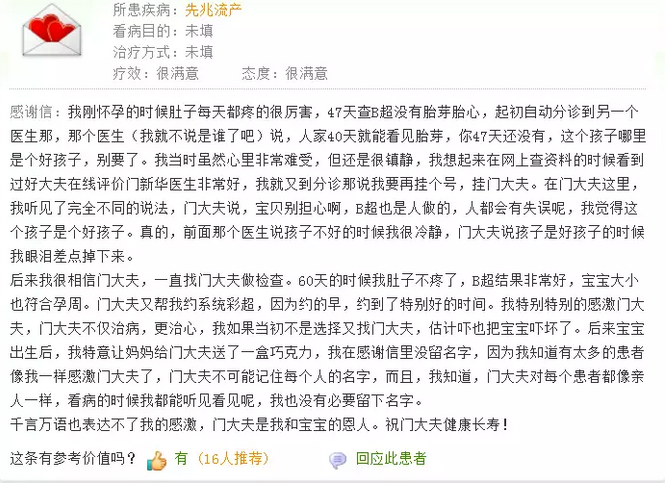 五年前,门新华曾接诊到一位怀孕47天还看不到胎芽和胎心的孕妈,腹中的宝宝已经被许多医生下了“病危通知书”,可在门新华这里却听到了完全不一样的说法:“宝贝别担心啊,B超也是人做的,难免会有失误的时候,我觉得你这个孩子就是个好孩子。”8个月后,宝宝平安降生了,心怀感激的孕妈在门主任的主页留言道:“您是我和宝宝的恩人,因为您不仅治病,更治心!”
