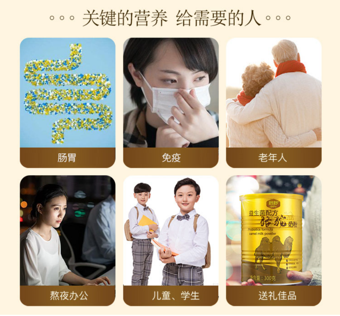 启舒骆驼粉不同于市面其他的骆驼粉品牌,在原有新鲜纯正的驼奶基础上添加了两种益生元+益生菌组合,当人体长期补充益生菌时,益生菌就会在肠道内大量繁殖,与有害菌作斗争,能抑制有害菌的生长,维持肠道生态平衡,产生人体生物保护屏障,提高机体免疫力抗病力,抵抗癌细胞生长,促进皮肤健康,祛病强身,美容保健,延年益寿,这就是启舒骆驼粉在市场众多类似的产品中,更加受到消费者青睐的原因!