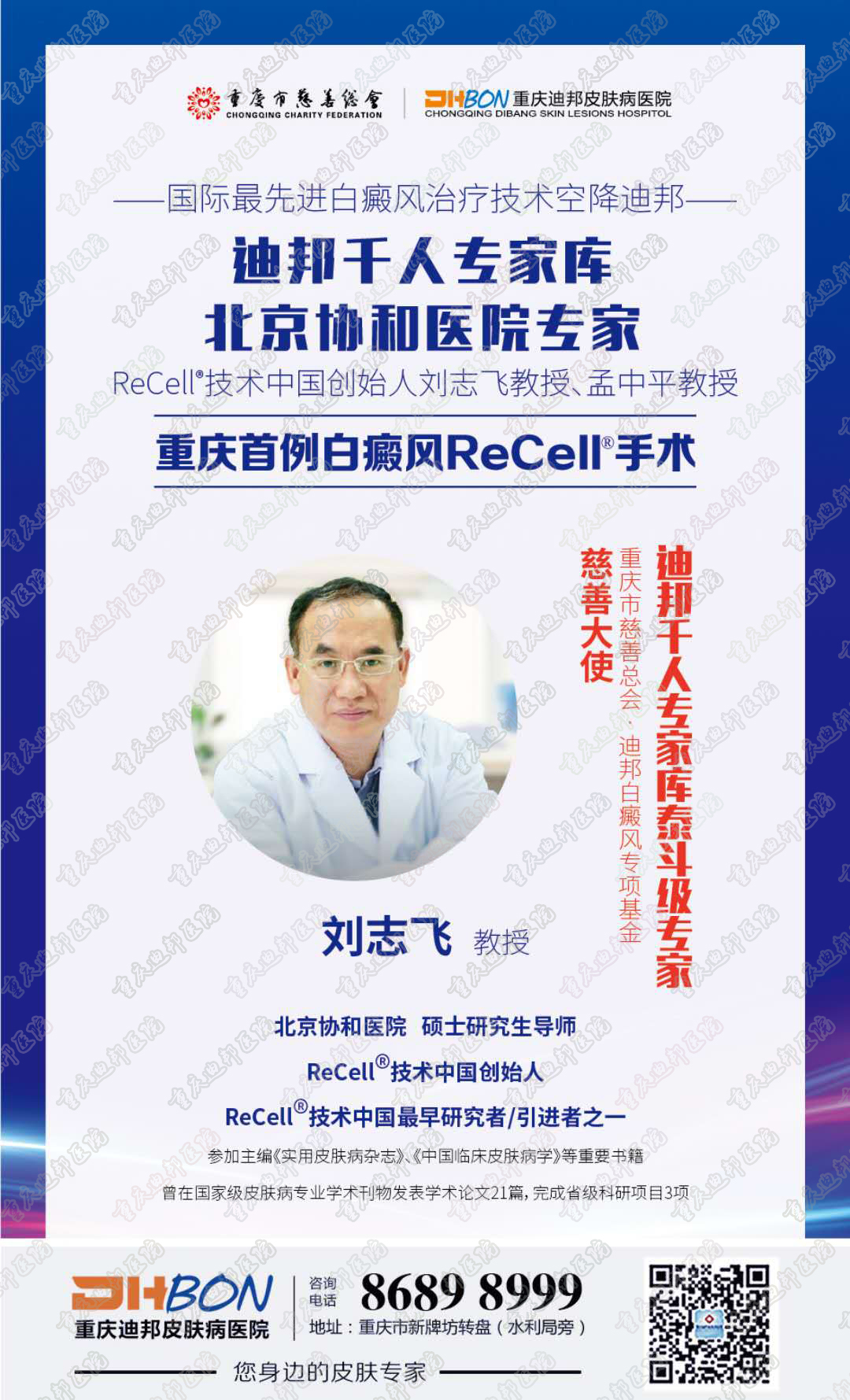 目前,重庆迪邦皮肤病医院首家引进成为ReCell®细胞再生术临床认证基地,也是唯重庆一一家能够进行是ReCell®手术的医疗机构。为进行白癜风公益宣教,重庆市慈善总会联合重庆迪邦皮肤病医院,特别邀请了迪邦医院的千人专家库成员——中国区ReCell®技术创始人、北京协和医院刘志飞教授及团队,中国区ReCell®技术发起人孟中平教授空降重庆亲自进行手术直播,同时为广大白癜风答疑解惑,让更多人了解ReCell®细胞再生术,增强对恢复白癜风的信心,一起对抗“白魔”!